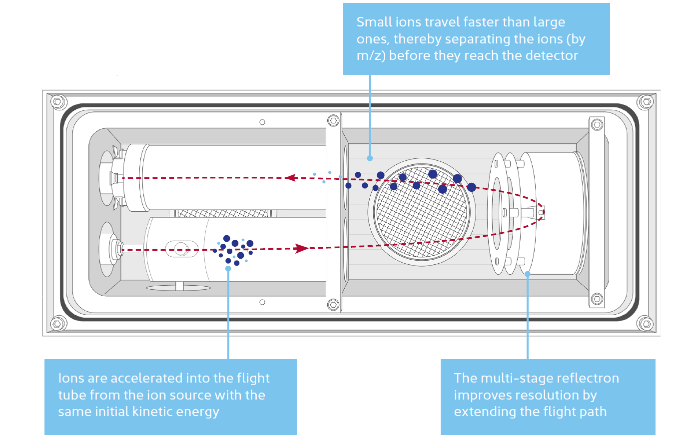 The principle of operation of a TOF mass spectrometer (in this case SepSolve’s BenchTOF2). The path taken by the ions is shown by the dotted red line.