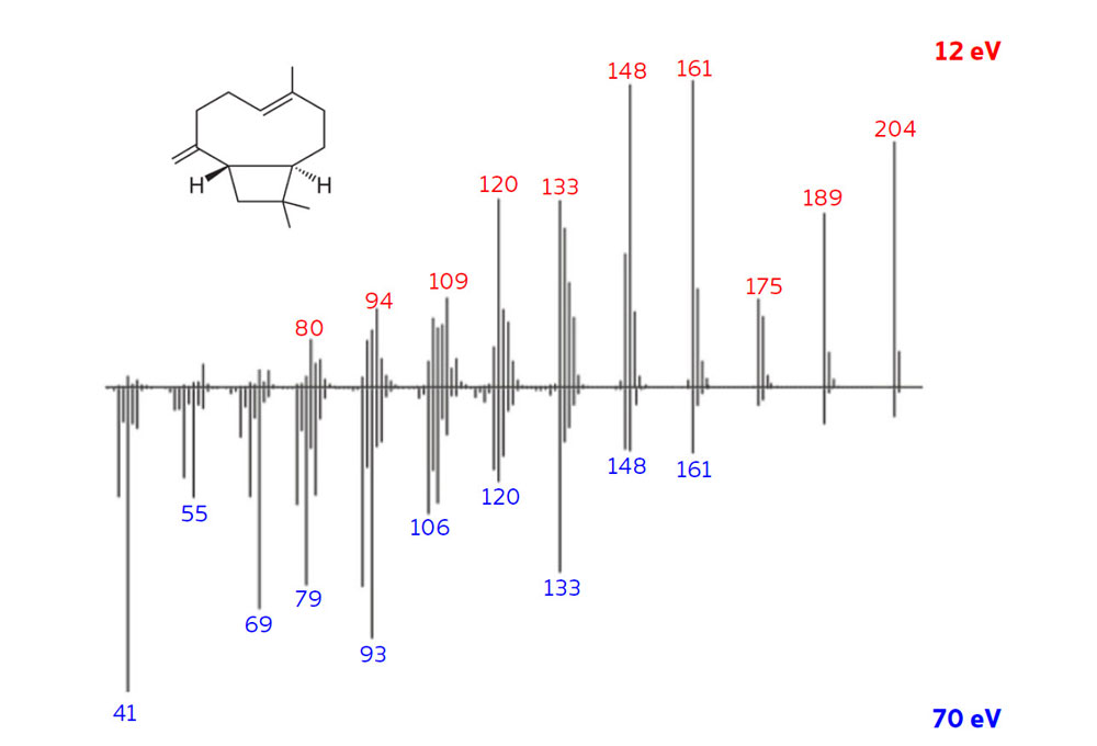 This pair of EI spectra acquired on BenchTOF2 show the extensive fragmentation of caryophyllene that occurs at 70 eV, and how this is resolved using soft ionisation at 12 eV – which thanks to the ion optics used, is achieved while maintaining sensitivity at acceptable levels.
