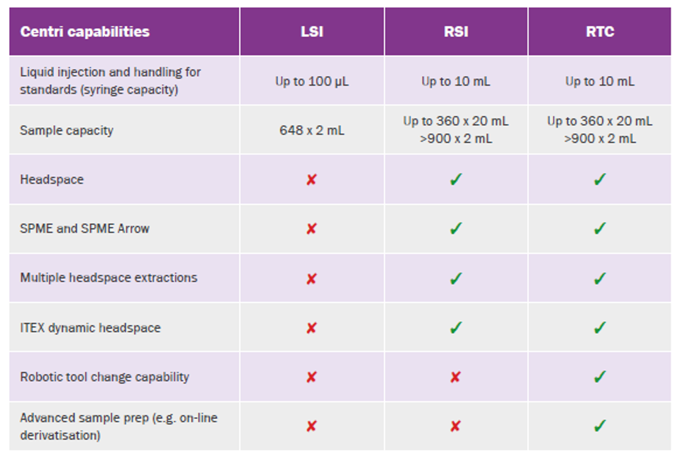 - Range of sample prep options: From liquid extraction to headspace analysis and beyond, Centri PAL3’s extensive sample preparation capabilities reduce or eliminate manual sample processing.