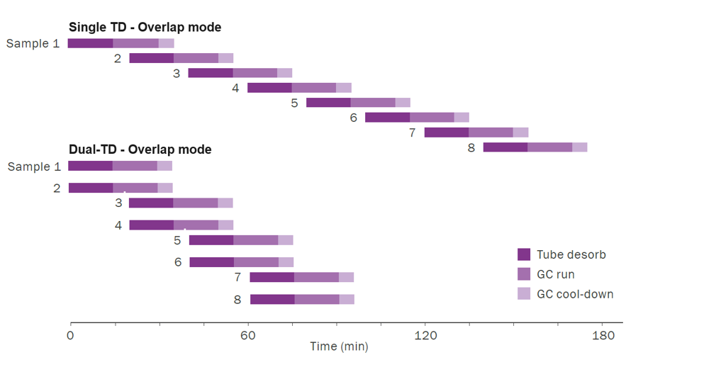 This graphic shows how using overlap mode with Dual-TD increases productivity by allowing more samples to be analysed simultaneously.